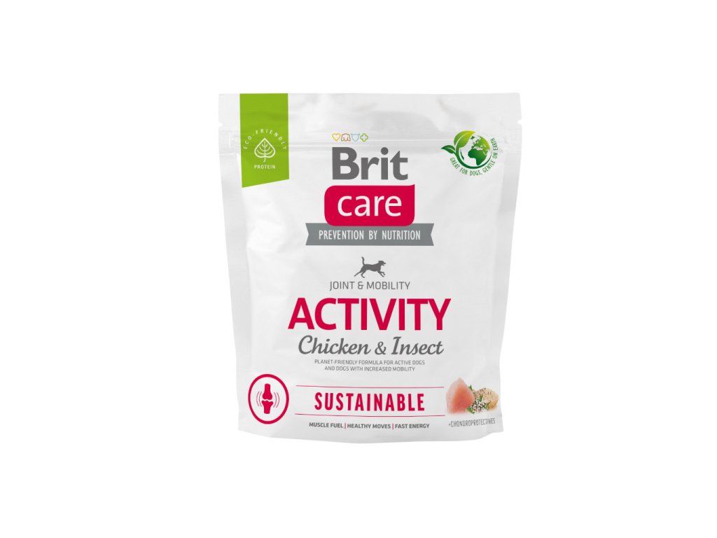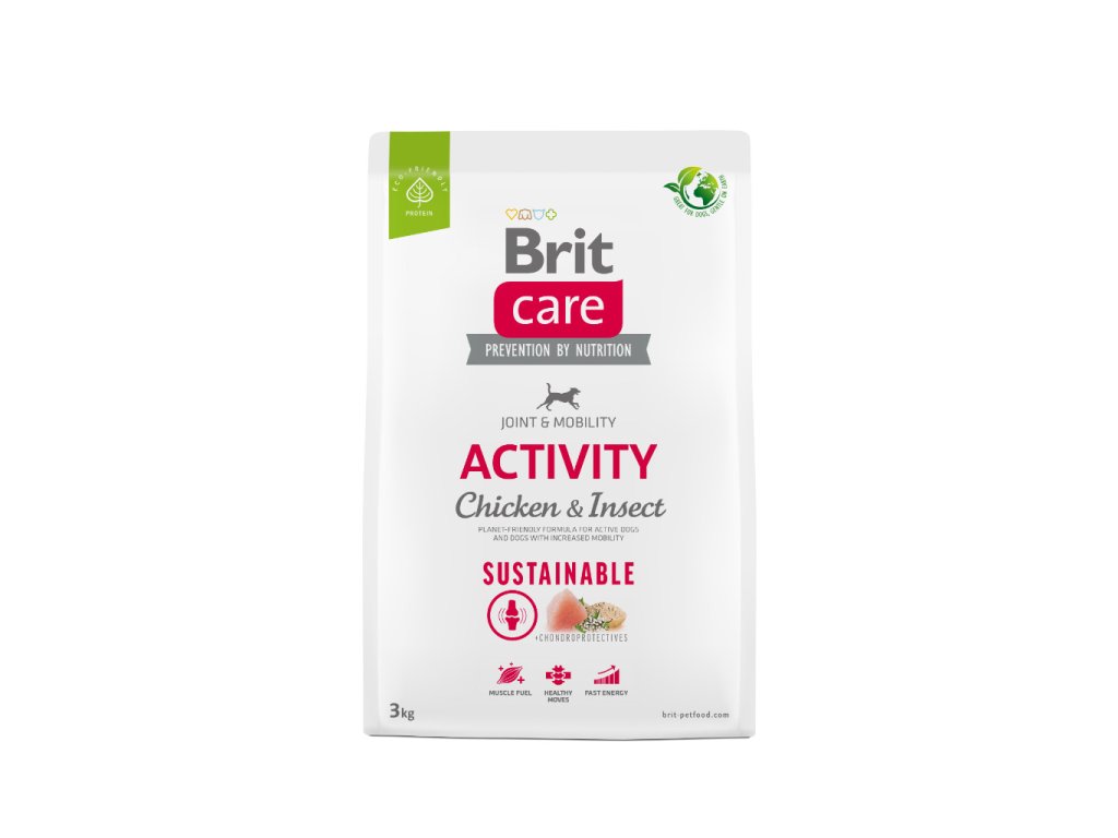 Brit Care Dog Sustainable Activity. Receptura Kuře a hmyz pro aktivní psy a psy se zvýšenými nároky na pohybový aparát. Kompletní krmivo pro psy.