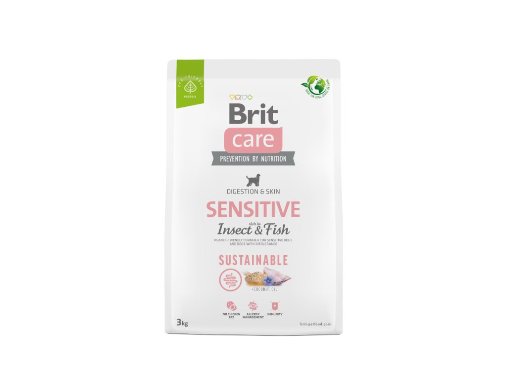 Brit Care Dog Sustainable Sensitive. Bezobilná receptura z udržitelných zdrojů surovin bohatá na hmyz a rybu pro citlivé psy a psy s intolerancí. Kompletní krmivo pro psy.