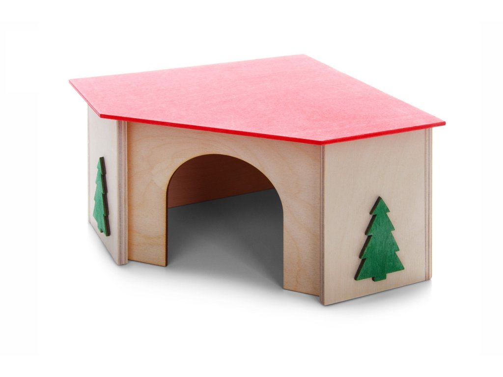 Střední dřevěný domek do rohu pro morčata. Domek je vyrobený z překližky a je namalován zdravotně nezávadnými a netoxickými barvami. Domek je ideální skrýší pro morčata, má velký vstupní otvor a stromečky po stranách.