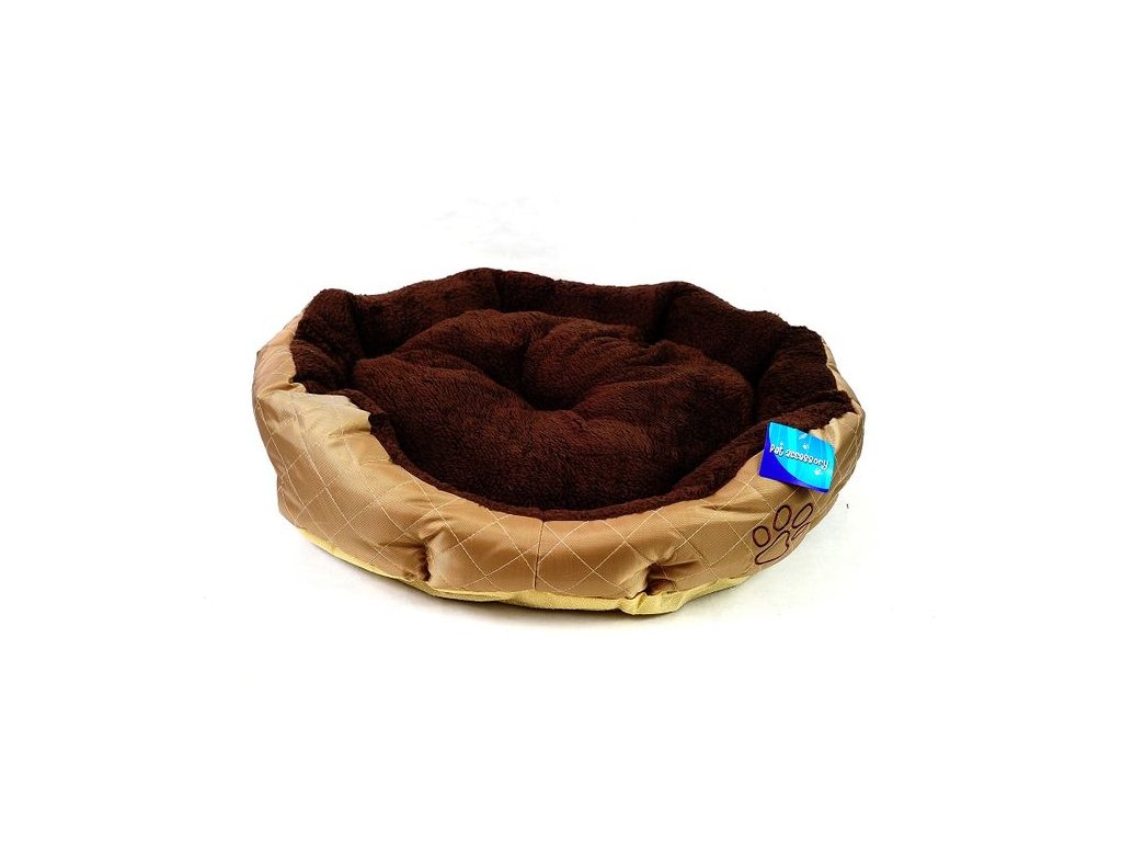 Hnědobéžový oválný pelech pro psy o velikosti 57x52 cm. Vnějšek pelechu je šušťákový a vnitřek z umělé kožešiny. Okraj pelíšku je vyvýšený. Vnitřní polštář se dá vyjmout. Dno pelechu je z protiskluzového materiálu. Pelech je snadno pratelný.