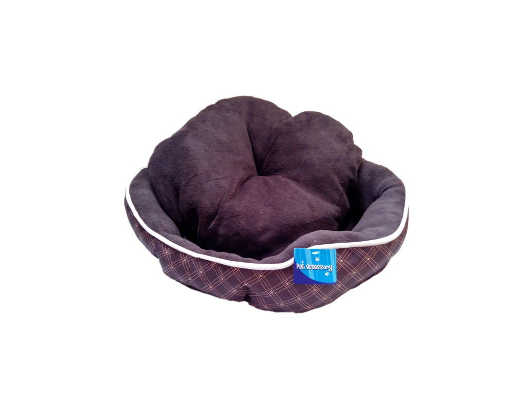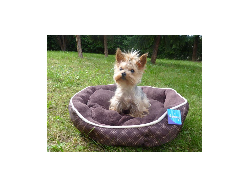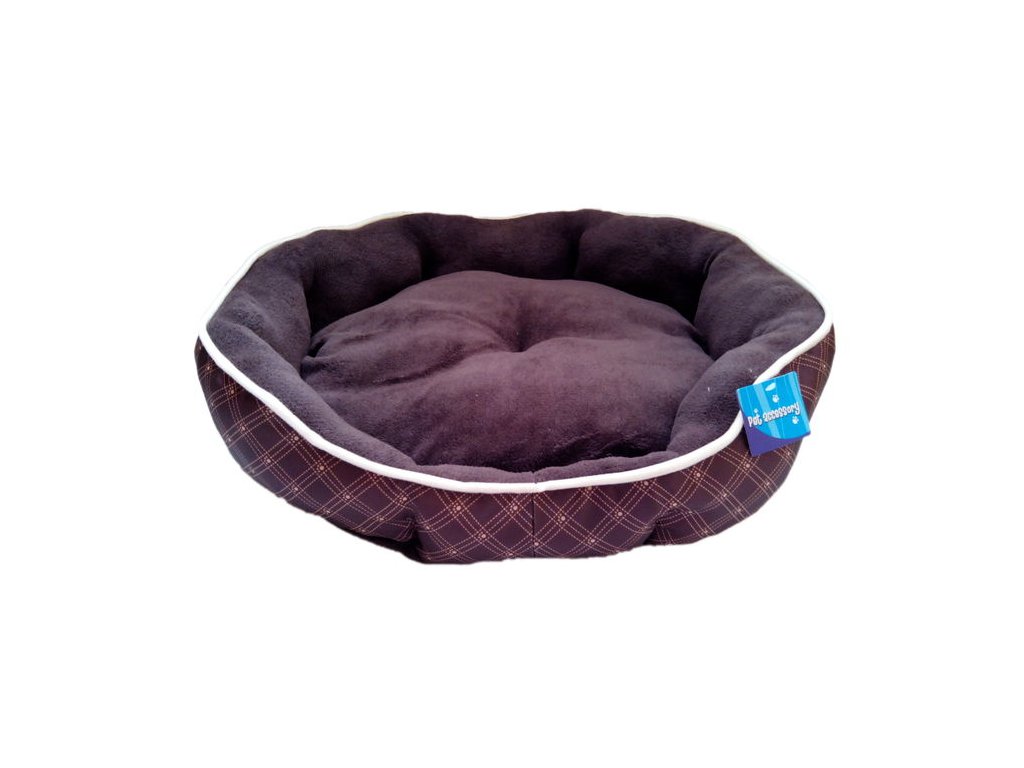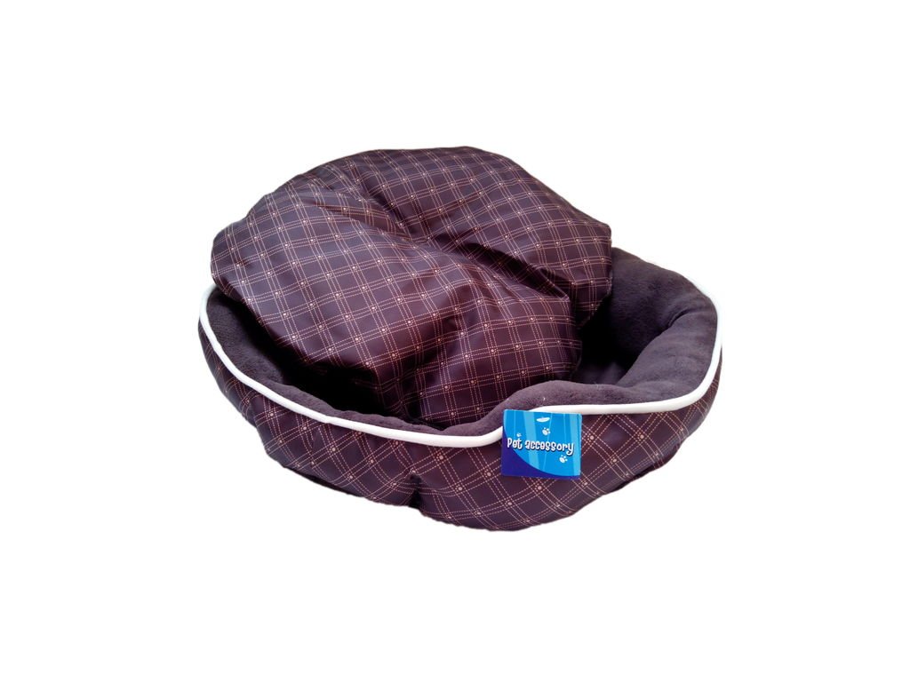 Hnědý oválný pelech pro psy o velikosti 57x52 cm. Vnějšek pelechu je šusťákový a má pravidelný vzor, vnitřek je z fleecu. Vnější polštář je vyjmutelný a má zimní a letní stranu. Dno je vyrobené z protiskluzového materiálu.