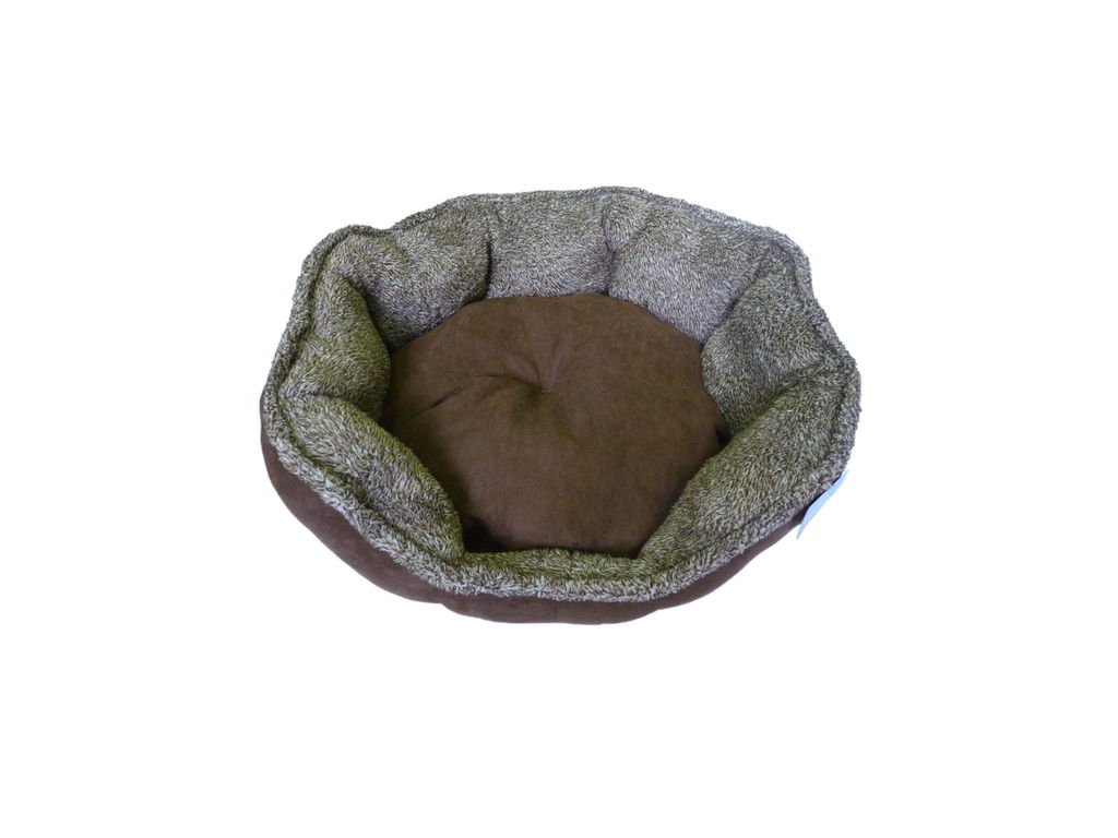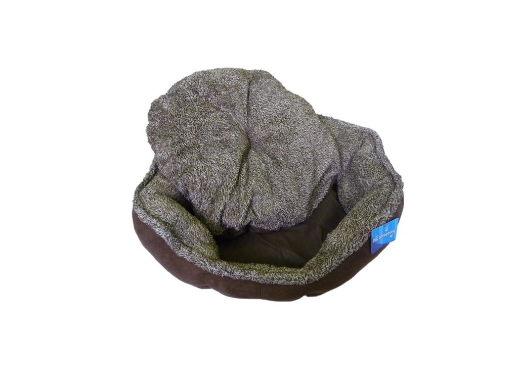 Hnědý oválný pelech o velikosti 57x52 cm. Pelech je vyrobený z mikrovlákna a umělé kožešiny. Vnitřní polštář je vyjmutelný. Dno pelechu je vyrobené z protiskluzového materiálu. Pelech je snadno pratelný.