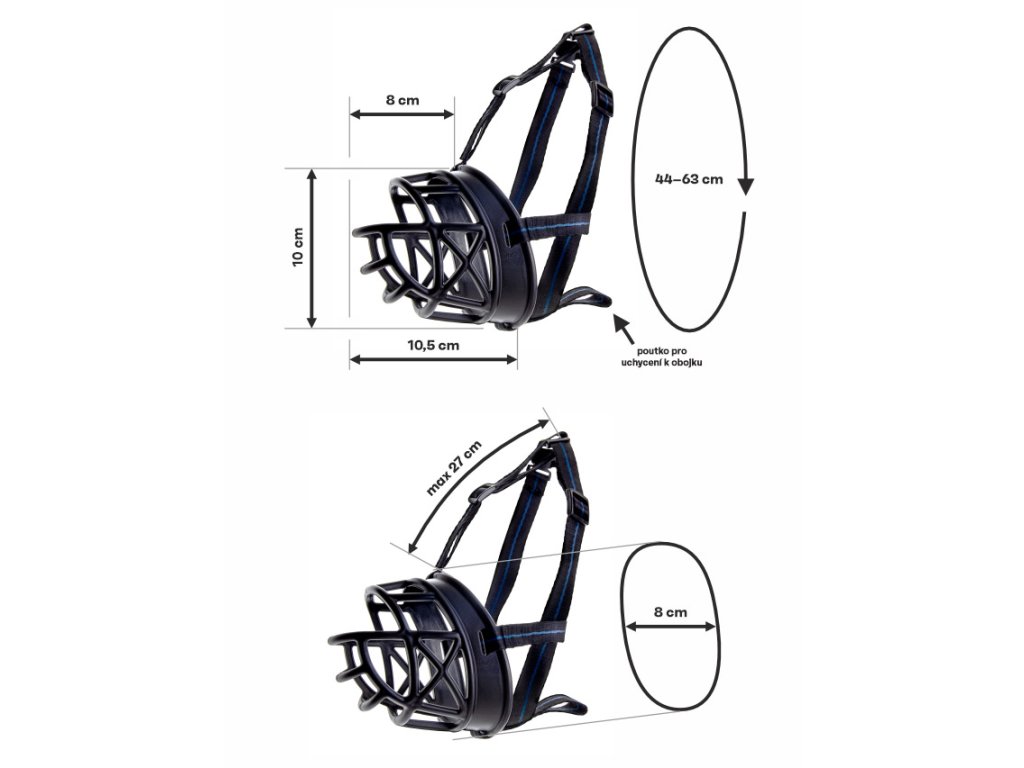 č.3 - rozměry plastového náhubku: 8 × 10,5 × 10 cm, vnitřní šířka plastového náhubku: 8 cm, rozměry nastavitelného popruhu: průměr 44–63 cm