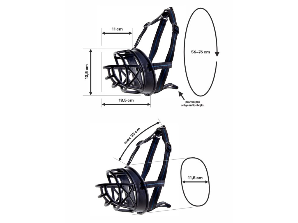 č.6 - rozměry plastového náhubku: 11 × 13,5 × 13,5 cm, vnitřní šířka plastového náhubku: 11,5 cm, rozměry nastavitelného popruhu: průměr 56–76 cm