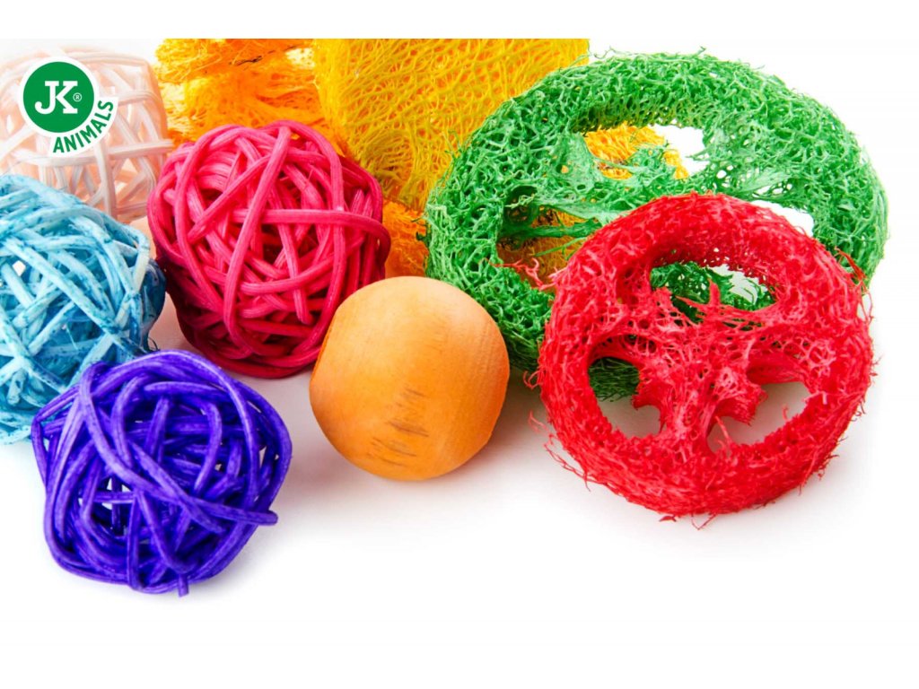 Mix hraček, ratanové koule, dřevěná kulička a lufa houba pro křečky, králíky a jiná malá zvířata. Velikost 4–8,5 cm. Hračky jsou vyrobeny z ratanu, ze dřeva a lufa houby.