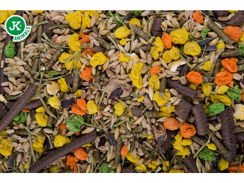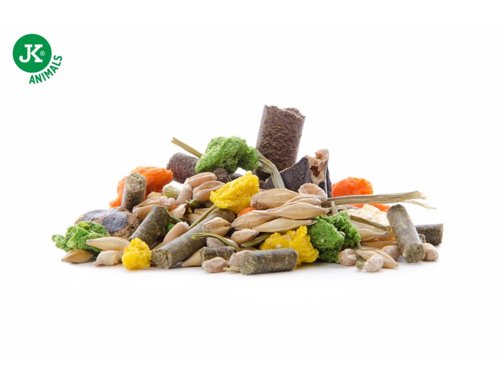 Složení: granule – úsušky pícnin, pšenice, ječmen, extrudovaná kukuřice, svatojánský chlebíček, slunečnice, kukuřičné lupínky, hrachové lupínky, extrudovaná petržel, mrkev.