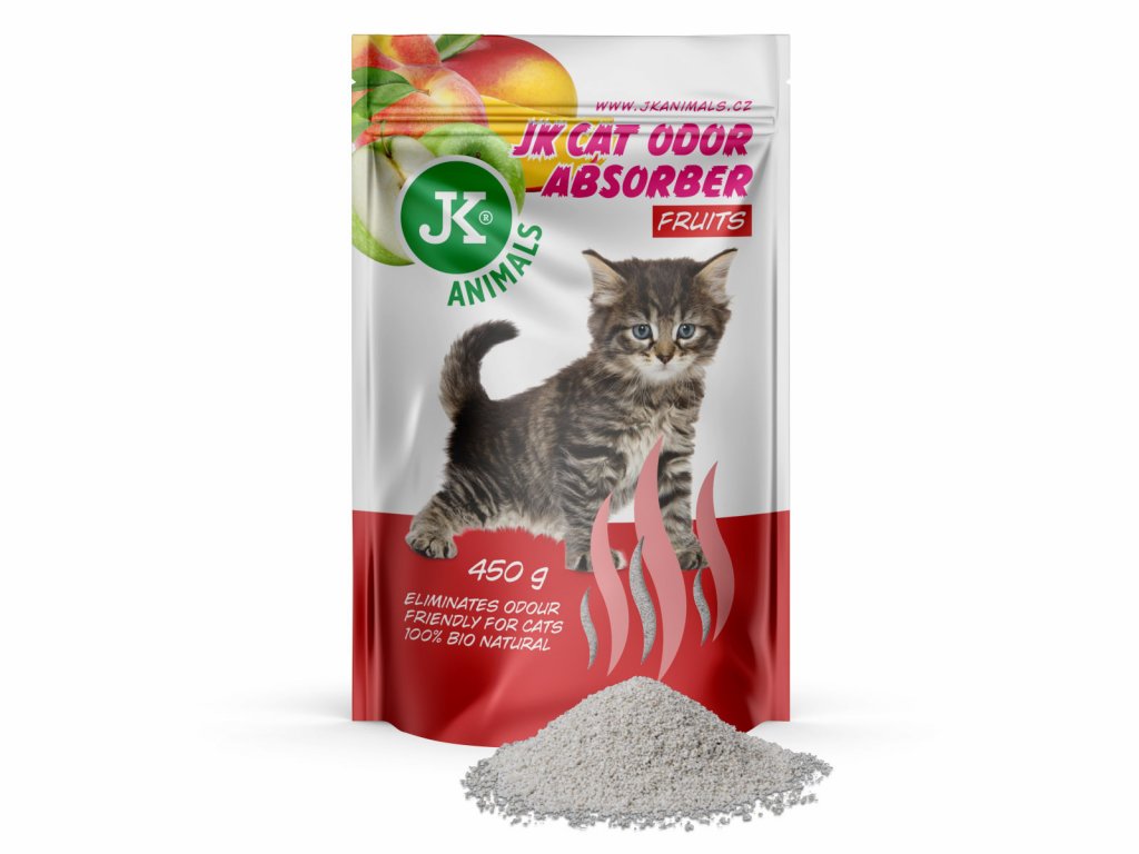 JK FRUITS ABSORBER. Pohlcovač zápachů s vůní ovoce velmi dobře neutralizuje nepříjemné pachy, účinně odstraňuje všechny mikroorganismy, bakterie a plísně. Ideálně podporuje účinek kočkolitů: zvyšuje jejich účinnost, předchází přilnutí hrudek na dno kočičí toalety.