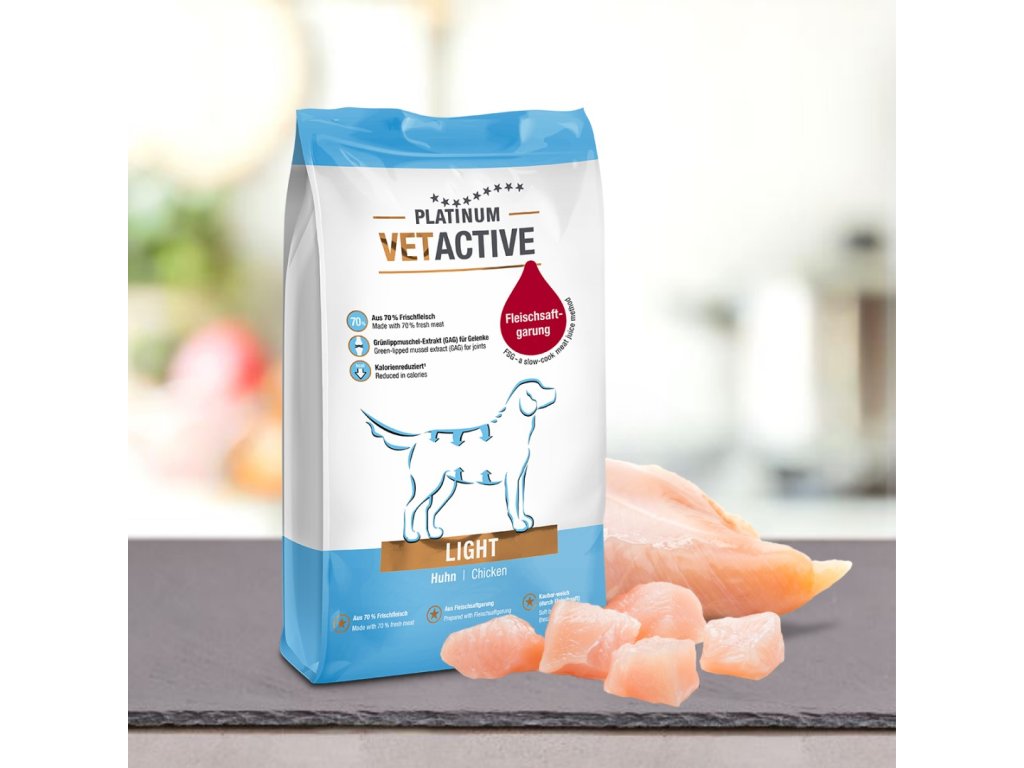 S PLATINUM VETACTIVE Light dostane váš pes vyvážené dietní krmivo, které je šetrné ke slinivce a nabízí mu plný chuťový zážitek.