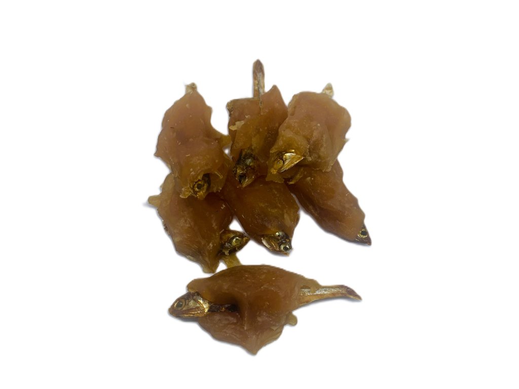 Křehká rybička je omotaná voňavým kuřecím masem. Malá plemena psů na chvilku zabaví, to samé platí i pro kočky. Větší plemena psů rybičku dvakrát až třikrát žvýknou.
