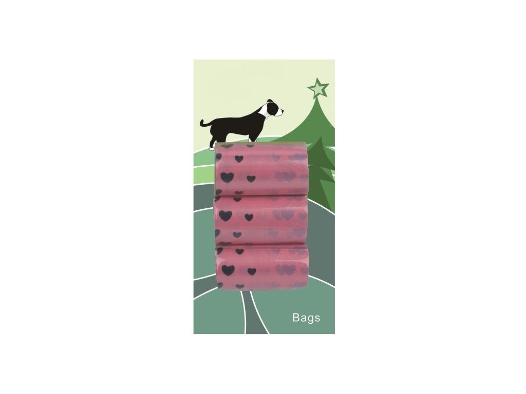 Růžové sáčky na výkaly s motivem. Balení obsahuje tři role, každá z nich pak obsahuje 20 sáčků.