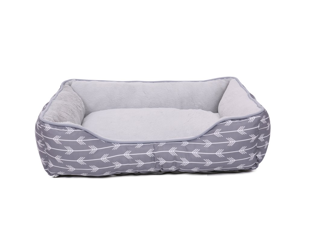 Šedý hebký obdélníkový pelíšek pro psy. Pelíšek je snadno pratelný, s vyndavatelným polštářem a protiskluzovým dnem. Rozměry 75x58x19 cm.