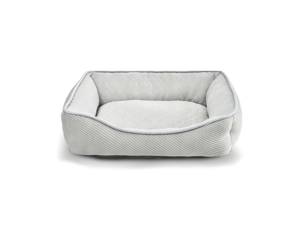 Pevný velký pelech obdélníkového tvaru s vyvýšeným okrajem o velikosti 90x69x15 cm. Polštář není vyjímatelný. Krásný jemný přírodní detail prošívaná uvnitř pelíšku. Vrchní hrubší materiál má jemná vzor proužku. Protiskluzové pecičky.
